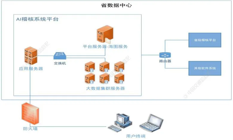 數(shù)據(jù)源是開展收費稽核工作的基礎(chǔ),包括通行、交易、牌識、視頻等采集數(shù)據(jù)和車輛發(fā)行、路網(wǎng)、費率、節(jié)點等基礎(chǔ)數(shù)據(jù),具體如下[8]。1、車道收費數(shù)據(jù)具體包括車道收費交易數(shù)據(jù)和車道牌識數(shù)據(jù),其中車道收費交易數(shù)據(jù)包括出入口站點、出入口時間、車牌、車型、軸重、軸數(shù)、行駛里程、收費金額等;車道收費牌識數(shù)據(jù)包括收費站編號、抓拍時間、識別車牌號、識別車型、抓拍圖片等。2、門架計費數(shù)據(jù)和牌識數(shù)據(jù)具體包括門架計費交易數(shù)據(jù)和門架牌識數(shù)據(jù),其中,門架計費交易數(shù)據(jù)包括入口信息、交易時間、車型、車牌、計費里程、計費金額等;門架牌識數(shù)據(jù)包括門架編號、抓拍時間、識別車牌號、識別車型、拍攝位置、抓拍圖片等。3、發(fā)行數(shù)據(jù)包括ETC和OBU的發(fā)行數(shù)據(jù),具體包括發(fā)行省份、發(fā)行時間、車牌、車型、顏色、圖片、軸數(shù)以及辦理人的相關(guān)信息。4、跨省拆分數(shù)據(jù)包括車輛跨省通行的車輛通行數(shù)據(jù)和收費數(shù)據(jù),具體包括車輛通行收費站出入口數(shù)據(jù)、車道交易數(shù)據(jù)、門架計費數(shù)據(jù)等信息。5、全省治超數(shù)據(jù)和治超牌識數(shù)據(jù)主要包括車輛通行數(shù)據(jù)、計重數(shù)據(jù)和牌識數(shù)據(jù),具體包括車輛通行時間、車牌、車型、軸重、軸型、圖片等數(shù)據(jù)。(二) AI稽核系統(tǒng)設(shè)計思路1、AI稽核網(wǎng)絡(luò)拓撲AI稽核系統(tǒng)采用了大數(shù)據(jù)集群服務(wù)器、地圖引擎服務(wù)器、應(yīng)用服務(wù)器,網(wǎng)絡(luò)拓撲如圖2所示。其中,大數(shù)據(jù)集群服務(wù)器主要對收費數(shù)據(jù)、發(fā)行數(shù)據(jù)、拆分數(shù)據(jù)、治超數(shù)據(jù)、牌識數(shù)據(jù)接收、存儲以及對稽核模型、路徑還原等進行計算,還能通過倒排索引對數(shù)據(jù)進行高性能檢索;地圖引擎服務(wù)器主要實現(xiàn)地圖圖層加載、路網(wǎng)模型計算;應(yīng)用服務(wù)器主要實現(xiàn)對AI稽核系統(tǒng)的部署和接口的數(shù)據(jù)交互。