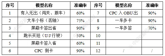 (四)稽核模型建立與準確率驗證本文所述AI稽核系統(tǒng)根據(jù)不同逃費類型建立對應(yīng)模型,目前已實現(xiàn)大車小標、有入無出、屏蔽卡簽入省、屏蔽卡簽出省、跑長買短、CPC倒卡、CPC入OBU出、一車多卡、一車多簽等近10種偷逃費行為稽核。以大車小標偷逃費行為進行舉例說明。改變車型(車種):大車小標是指發(fā)行車型跟實際車型不符。通過非法手段辦理或套取使用與實際車型不符的車輛標簽,達到偷逃費的目的?;藬?shù)據(jù)驗證方式如下:(1)通過交易數(shù)據(jù)中的車牌、車牌顏色和車型與發(fā)行數(shù)據(jù)對比,確定大車小標;(2)利用入口稱重數(shù)據(jù),在收費數(shù)據(jù)中的入口交易數(shù)據(jù)搜索軸數(shù)與車型不符的車輛;(3)搜索收費數(shù)據(jù)中的入口交易數(shù)據(jù),車型為一型貨車,且車牌顏色為黃色的車輛;(4)篩選車輛通過ETC專道和人工車道的收費車型存在不一致的情況,通過車牌號篩選某個車牌多次出現(xiàn)兩個及以上的車型的車輛;(5)對篩選出的車輛,根據(jù)大數(shù)據(jù)平臺圖片、交易數(shù)據(jù),對特征點進行對比分析,形成初步結(jié)論。通過對稽核模型分析數(shù)據(jù)與稽核人員核實數(shù)據(jù)對比分析,進行稽核模型分析篩查準確率驗證,稽核模型準確率如表2所示。屏蔽卡簽、倒卡通行介質(zhì)等稽核模型準確率較高,達90%,有入無出(闖關(guān)、跟車)、跑長買短(U/J行駛)因系統(tǒng)及計費規(guī)則、現(xiàn)場管理和證據(jù)獲取等多重因素影響,準確率為50%~60%左右,但能夠滿足稽核業(yè)務(wù)需求。稽核模型準確率如表2所示。